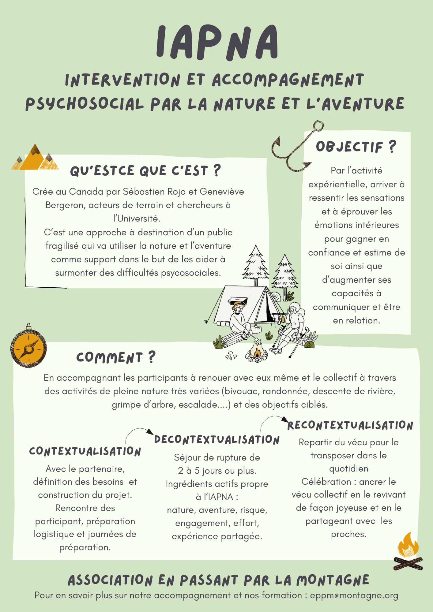 | Proposer un panel d'activités de moyenne et haute montagne suscitant des émotions, des réactions, des questionnements, des efforts : randonnée pédestre, avec ânes et tipis, escalade, via ferrata, raquettes, cascade de glace, randonnée glaciaire, ascension d’un sommet…